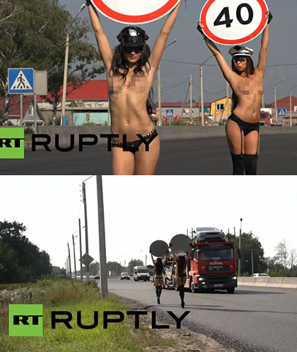 ![]() 据英国《太阳报》报道,两名身材火辣的俄罗斯模特为了提醒司机保持限速,赤裸上身在公路旁高举限速牌。 每小时便会受罚。此次活动的想法正是在法规变更前由公共组织“汽车运动(Autodvijenie)”所提出。 |