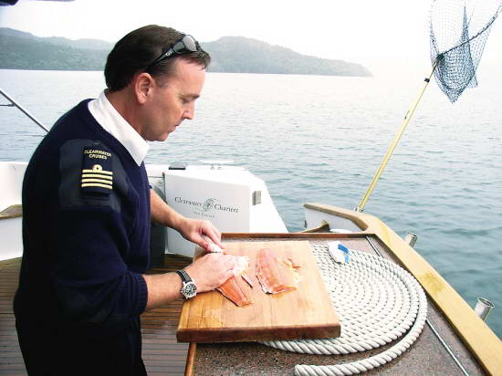 那天同行中有个男孩钓到了一尾红鳟鱼。“可以做鱼生啦。”船长说。变魔术一般,砧板和刀具立刻现身,接着他熟练地开膛、剔骨、切片、摆盘……然后是我们一拥而上,风卷残云。