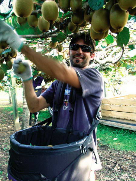 这个时节正是奇异果成熟的季节,果园里到处都是沉甸甸的果实挂满枝头的丰收景象。新西兰人口稀少,每到秋天需要大量劳动力采摘果实的时候,相关公司总会到世界各地召集人力。因而当我走进果园参观时,就像来到了一个小小联合国,不同肤色、来自不同地域的年轻人在此手脚麻利地采摘果实,像一只只袋鼠一般———装奇异果的篮子就挎在他们的胸前。
