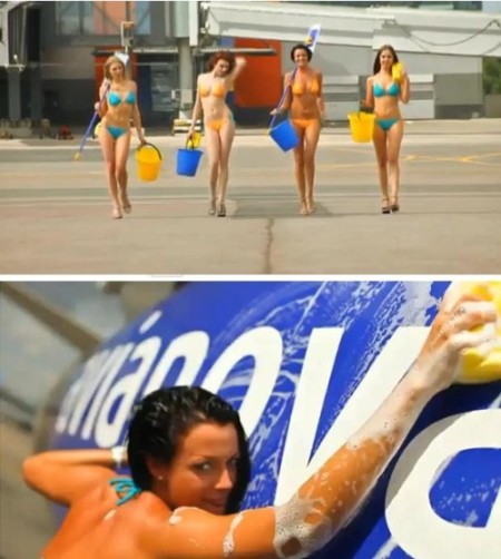 俄航公司拍性感广告揽客 半裸空姐洗飞机