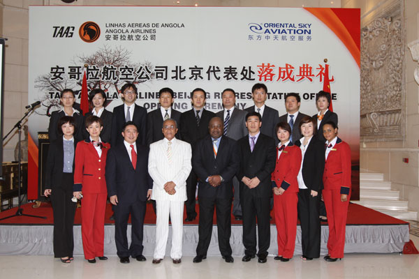 2010年7月29日上午,安哥拉航空公司北京代表处落成典礼暨剪彩仪式在位于北京新源南路14号的北京代表处和北京昆仑饭店隆重举行。安哥拉共和国驻华大使若奥•贝纳尔多阁下,以及巴西、几内亚、刚果、南非、毛里求斯、喀麦隆、古巴等多国驻华大使冒着酷暑出席了仪式。 安哥拉航空公司驻中国首席代表安东尼奥•英纳乔先生、安哥拉航空公司中国地区销售总代理东方中天航空服务有限公司有关人员、近百位客货运销售代理、机场地面服务公司、多家著名媒体共同出席了落成典礼。 安哥拉大使若奥•贝纳尔多先生为代表处落成剪彩并发表了热情洋溢的致辞。他表示,自2008年12月罗安达至北京航线开通以来,安哥拉航空公司承担起了推进安哥拉和中国之间经贸往来的重任,为繁荣安、中两国的双边交流作出了卓越贡献,也为联接非洲和中国,促进非中友谊的发展起到了积极作用。 安哥拉航空公司驻中国首席代表安东尼奥•英纳乔先生在致辞中介绍了安哥拉航空公司的悠久历史及快速发展历程、罗安达-北京航线等情况,对来自广大合作伙伴的支持表示了衷心的感谢。