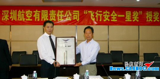 图2:中国民用航空中南地区管理局副巡视员徐麦秋(右)向深圳航空有限责任公司颁发“飞行安全一星奖”奖牌。摄影:马力