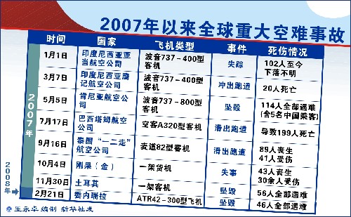 2007年 1月1日,印度尼西亚亚当航空公司一架波音737-400型客机从爪哇岛泗水飞往苏拉威西岛万鸦老的途中失踪,机上102人至今下落不明。 5月5日,肯尼亚航空公司一架波音737-800型客机在喀麦隆滨海省坠毁,机上114人全部遇难,其中包括5名中国乘客。 7月17日,巴西塔姆航空公司一架空客A320型客机在圣保罗孔戈尼亚斯机场降落时滑出跑道,先后撞上附近的燃油站和仓库并引发大火,导致机上及地面共199人死亡。 9月16日,泰国“一二走”航空公司一架麦道82型客机在普吉国际机场降落时滑出跑道,折为两段并起火爆炸,导致89人死亡、41人受伤。 11月30日,土耳其一架客机在该国伊斯帕尔塔省的一个村庄附近坠毁,机上49名乘客和7名机组人员全部遇难。 2008年 2月21日,委内瑞拉圣芭芭拉航空公司一架客机在安第斯山区的荒漠地带坠毁,机上43名乘客和3名机组人员全部遇难。 4月15日,刚果(金)一家私营航空公司的客机在东部城市戈马市机场附近坠毁并引发火灾,导致50多人死亡。 8月20日,西班牙航空公司一架麦道80型客机从马德里机场起飞时冲出跑道并起火,造成154人死亡、18人受伤。 8月24日,一架波音737型客机在吉尔吉斯斯坦首都比什凯克的马纳斯国际机场附近坠毁,导致65人死亡、22人受伤。遇难者中包括1名中国人。 9月14日,俄罗斯国际航空公司一架载有82名乘客和6名机组人员的波音737型客机在乌拉尔山脉中部彼尔姆市附近坠毁,机上88人全部遇难。