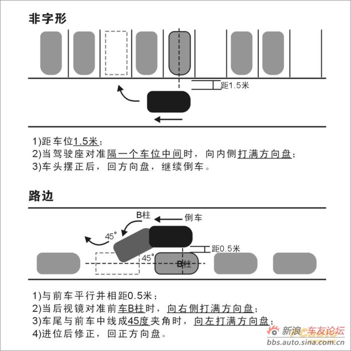 图中所示是一些最基本的倒车情况,学会了这些,其他问题也能迎刃而解。 倒进车位是绝招,倒车时别忘了打转向灯示意。 车与马路牙子相距10-20cm为宜,大概就是一个反光镜的宽度。 倒车前首先看清车后的情况,估计好倒车的行进路线,确定车头是否会碰到障碍物,倒车时尽量不要踩油门,控制车速不要太快。 根据车尾行进方向的需要,用左手转动方向盘:如果车尾需要向右后方行进,则将方向盘向右转动;反之,则将方向盘向左转动。实际上这和汽车向前行驶时的转向操作是一致的,记住这点就不会打错方向而手忙脚乱了。 在倒车过程中不要一直看着车后,在确认车后安全的前提下,需要不时地观察左右后视镜,注意障碍物与车身之间的距离,并据此利用方向盘来修正车身后退时的位置。 如果觉得在倒车过程中,车头有可能会碰到障碍物,则还需要在适当的时候看看车前。特别是在方向盘转动幅度较大的情况下,由于汽车在转向过程中,转向轮的转弯半径要大于后轮的转弯半径,在倒车时车头部向外甩的幅度也大,所以一定要注意车头避免碰擦。 不要养成原地打方向盘的习惯,这样更容易损坏车辆,而且打起来也很费事。 停车入位不再困难(3) 开车新手技巧:一点技巧+经常练习=停车入位不再困难 很多刚刚上路的车主在停车入位时都会发现这么一个事实:在驾校练得最熟的穿桩和移库,怎么到实际中都用不上了呢?看别人停车,轻松入位而且车正轮直;而自己停车,转向盘左打右打,车子就是弄不顺,好容易停进车位了,下车一看,自己的车成为了车位的对角线,那叫一个难看。其实,停车和开车一样,都是熟练活儿。只要掌握了一点点技巧,再加上经常练习,停车入位将不再困难。 ![]() 停车入位一般有两种情形, 一种是路边停车,一种是停车场停车。在这两种情形下,停车技巧略有区别。相对来说,停车场停车较为简单一些,无论是正向驶入车位或者倒入,只要掌握好转弯的角度,一般新手还是比较容易将车停入车位的。而路边停车就不同了,一般这种车位都设在辅路或者非机动车道上,路面相对来说较窄,而且有很多的机动车、非机动车以及行人,路面状况比较复杂。这种情况下车主容易紧张,很难掌握停车的要领。即使有人在指挥,也经常有车主在停车位边上又上又下,就是无法顺利地将车停入车位。本刊针对这一点,谈一下路边停车的相关技巧。 一般车主需要在路边停车时都是边开车边寻找车位,一旦看到车位后,就迫不及待地向右转,往车位里扎,等车头快到马路牙子了才向左转动转向盘,希望以此方法将车顺入车位。这种方法对于连续两个以上的空车位还适合,车主将车停入最前一个车位应该不是问题。但现实情况往往是,只有一个车位,前后都有车,那么以此种方法入位的结果将是车头顶在车位的右前角,而车尾还在车位外边。 其实,要在这种车位停车,关键在于向右转的时候不能“贪进”。 ![]() 具体分为以下几步: 步骤1.在缓慢前行中先将转向盘向右转一圈半左右,待右前轮越过车位外侧线1/3~1/2时,就赶紧向左转。 步骤2.当车头接近前车车尾时,挂倒挡,向右转动转向盘倒车,当从右后视镜中看不到马路牙子时,迅速向左转动转向盘接近极限位置并继续倒车。 步骤3.当从左侧后视镜中观察到车尾左侧与后车左前角对齐后,回转转向盘并停车。这时您的车基本在车位偏后的位置,即使不正也相差不远,而且前方还留出一定的距离。 步骤4.向前缓慢行驶并调整一下转向盘的角度,使车停在车位正中,前后留有一定的距离。 其实,路边停车还有一种相对简单的方式,那就是先将车前行越过车位与前车平齐,两车之间的距离视车位长短以及路面宽度而定。然后向右转动转向盘接近死点位置向后倒,直到车的右前角接近前车左后角时,将转向盘开始往回转。开始时,转向盘回转速度慢一些,当车头越过前车后保险杠后,将转向盘向左转至接近死点位置。待从左后视镜观察,车尾左侧与后车左前角对齐后,迅速将转向盘回正并停车。剩下的,就是稍微修正一下,将车停放在车位中间即可。 路边停车时要注意3点: 第一,在倒车过程中要注意后方的机动车、非机动车以及行人。 第二,不管用哪种方法切入时都要注意,在回轮过程中,掌握好回轮的速度,以免车的右后侧或右前侧与后车的左前侧或前车的 左后侧相蹭。 第三,千万不要逆向停车,否则你很有可能会领到一张交通罚款单! |