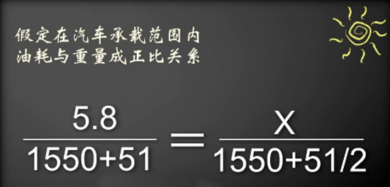在实验开始之前,我们先来看看网友给我们算的一笔账。以迈腾1.4T为例,油箱容积为70L,93号汽油密度为0.725kg/L,满箱油重量为51kg;迈腾自重为1460kg、司机体重60kg、其它负荷30kg,因此总重为1550kg。