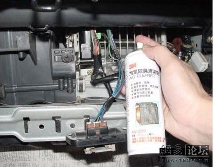 然后把冷气清洁剂从风速电阻固定口喷入,直到清洁剂喷完位置,需要注意的是,有些车的风箱比较小,可以看情况分两次喷完的。然后等着10~15分钟的样子,药剂产生的泡沫消掉后,再将风速电阻装回去