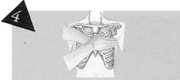 由病人的胸部(近施救者侧),找寻肋骨下缘,沿肋骨缘向上滑动,至肋骨与胸骨交汇的胸窝处,即为按压位置。