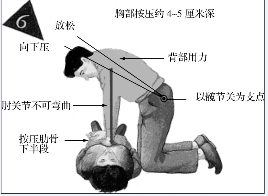 ·按压的姿势。双臂伸直,使用身体的重量均匀地按压。按压要有规律,不要左右摇摆,也不要冲击似的按压。按压的频率成人是100次/分钟,按压的力度就是胸骨下陷4~5厘米。