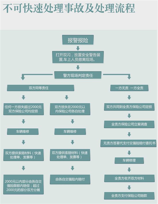 在本文中,我们主要为您介绍一些路面上常见的交通事故处理办法,如果有小事故发生,您可以此为例,很容易分清路面上的大部分责任。 单车事故处理流程: 单车事故是指在机动车发生的交通事故中,事故当事人仅机动车一方,无其他事故当事方的交通事故、(在机动车保险关系中,单车事故还指无法找到相对方的机动车保险事故)。 单车事故的处理流程很简单,比如您撞到什么东西上了,如果车坏了东西没坏,那您只需要给保险公司打电话联系定损和理赔即可。但如果不巧车坏了东西也装还了,那就必须报警,然后再给保险公司报案,之后才可协商下一步的理赔事宜。 特定条件下的事故处理流程: 撞豪车: 现在路上的豪车越来越多,如果发生事故后的维修费用超过第三者责任险的赔付金额,那么多出来的部分需消费者自行支付。商业第三者责任险不同保险额度之间的价格差并不多,建议车主朋友根据自己的情况多上一些为好。 已买保险但未上牌: 保险生效之后,在去上牌的路上发生事故,这时车辆虽然还没有拍照,但在保险已经生效的情况下,消费者可以得到理赔。 停车场/地库: 停车场/地库等位置虽然并不属于正常道路,但当发生事故时依然按照道路法规进行责任划分。 4S店修车: 如果您的车辆寄存在4S店进行保养或维修时发生碰撞,建议您与4S店协商而不是走个人保险,因为虽然走保险不会产生费用,但对第二年的保费会有所影响。 撞公交车: 在公交车道内(有效时间段)社会车辆与公交车发生事故,社会车辆全责,在非公交车道或非有效时间内,公交车与社会车辆发生碰撞按正常交通事故处理划分责任。 驾驶员碰撞家庭成员: 当事故中的受伤一方为驾驶员的直系亲属时,保险公司不予理赔。有以下行为的,驾驶者要承担全部责任 1:闯红灯 2:装载的货物飘散、遗撒 3:未按规定装载货物 4:未按规定牵引车辆 5:未按指示灯方向通行 6:驶入禁行车道 7:违法掉头:在禁止掉头的路段掉头,发生事故要负全部责任 8:三轮车摩托车驶入禁行路 9:为服从交警指挥 10:未避让特种车辆 11:未避让作业车辆 12:进主路车辆为让行主路内的车:准备进主路车辆未让行主路内的车 要承担全部责任 13:辅路车辆未让出主路的车:在辅路行驶车辆未让行驶出主路的车 要承担全部责任 14:进出停车泊位的车未让行 15:坡路未让行 如果事故双方不能通过交通事故快速处理解决,或事故双方未能达成一致,那就只能等交警到现场进行处理了,下面的树形图就是不可快速处理事故的基本处理流程。 当这种情况发生时希望大家首先要控制情绪,第二在等待交警的过程中要注意安全,另外如果事故出现严重人员伤情,应对伤者进行优先救治,以防止不必要的意外发生 |