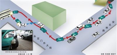 京华时报7月11日报道 前晚7点左右,北京市丰台方庄物美大卖场外,一女子开走一前来洗车客户的奔奔,在地下车库撞上两车,驶离车库一路连撞私家车、面包车、城管车、大巴、警车共7辆。最终,该女子被崇文区永外派出所民警拦下。目前,该女子已被丰台交通支队事故科带走接受调查。 奔奔洗车店神秘消失 据车主卢强回忆,前晚,他和往常一样将自己新买的奔奔开进物美大卖场地下二层车库,并直接停在车库内一洗车行前,将钥匙交给店内一刘姓女员工后。他搭电梯上楼购物。 卢强说,当他返回提车时,店内员工却告诉他,因附近车位已满,将其车停在车库另一侧。5分钟后,卢强没有等来自己的奔奔,却等来了一辆警车。 车上民警告诉卢强,“接到报警,此处刚发生车祸。”这时,洗车行的员工才告诉卢强,他的车被一名员工的亲戚驶离车库。 失车上路连撞9车 将卢强车开走的人名叫刘冬(化名),是拿到卢强车钥匙的刘姓员工的妹妹。洗车行老板王先生说,他听店内员工介绍,前晚,刘冬帮姐姐替卢强的车寻找车位,不料将两辆车剐伤,“应该是后面有车着急出库。”随后,刘冬直接将车开出车库。 王先生说,刘冬并非洗车行员工,他的一名员工曾试图在出口处拦下刘冬,但刘冬并未减速,直接撞断护栏离开车库。刘冬的姐姐说,“应该是害怕了。” 当刘冬驶出车库后,她开上了物美大卖场外的安乐林路。晚7点左右,韩先生正在那条路上等待绿灯通行,突然听见“嘣”的一声,车尾被后面的一辆车猛地撞了一下。韩先生说,随即,后车接连撞击他的车七八下,直至将他推出红绿灯等待线,“幸好当时南北向没车,不然我就没命了。” 韩先生正要下车,只见肇事的奔奔快速地驶离。韩先生说,因安乐林路车多路窄,平日他的速度不足30迈,但前晚,他以50迈的速度仍未追上刘冬,“她应该开到70迈。” 韩先生说,驶出几百米后,因撞上一辆城管车,刘冬被迫停下。韩先生下车后,拍打奔奔的车窗,试图让刘冬下车,但发现车门紧锁,“她一眼都没看我,只是直视前方。”随即,刘冬拐弯,不管红绿灯直接往前驶去。紧接着刘冬撞上一辆面的、一辆私家车。随后,刘冬向北转弯,驶上永定门外大街。 警车截下“最牛”奔奔 韩先生说,在永外大街上,刘冬直接与永外派出所门口一辆警车追尾,但她并未减速,继续行驶,并连撞两辆大巴。“她以为前面没路了”,韩先生说,刘冬随即调头向南行驶,与追来的警车相遇,“看到‘挡路’的警车,她直接撞上去,试图将车挤开。”昨天11点,记者看到,这辆事故警车停放在永外派出所门外,左侧前车门底部变形。 根据韩先生和其他两名被撞车主的回忆,目前,有9辆车被撞,“路边停放车辆可能有划伤。”韩先生说,刘冬一直不肯下车,在民警几次要求下,仍紧锁车门。最终,一名男子将驾驶位车窗砸破,将刘冬拉下奔奔车。 昨天,这辆最牛奔奔停放在永外派出所门口,它的前保险杠上留有各种颜色的车痕,保险杠三分之一脱落,机油洒了一地。一名事主说,事发后,他们打开车门,便闻到一股煳味,但车仍能行驶。 ■处理 赔偿未达一致车主苦守肇事女 洗车行老板王先生说,昨晚8点半左右,他接到员工电话得知刘冬开车闯祸一事。随后,他找到永外派出所,最终找到刘冬,并开始和其他事主谈赔偿事宜。 王先生说,前晚,他们并未就赔偿达成一致意见,所以他们决定按程序来解决这一事故。韩先生说,昨日凌晨两点,丰台一派出所民警和丰台交通支队曾前去永外派出所接人,但被告知,因交接手续问题暂时不能接走刘冬。 王先生和卢强等几名事主担心刘冬离开,于是站在永外派出所门口,看守刘冬。韩先生说,从前天凌晨两点到昨天上午10点,他一直打各部门电话,但一直无人处理此事。一名事主的双腿满是抓痕,她说,这都是前晚在马路上看守刘冬时所留,“晚上蚊子太多了。” 昨天12点左右,崇文分局民警前来协调此事。这时,韩先生和卢强等几名事主才敢在派出所的凳子上打盹。洗车行老板王先生双眼通红,“一宿了,但不解决这事,也吃不下睡不着啊。” 崇文警方表示,刘冬将永外派出所一辆警车划坏,但派出所没有处理权限。事发后,经各部门协调,目前,该女子已被丰台交通支队事故科带走并接受调查。 ■溯因 事发前受刺激肇事女举止异常 昨天上午,刘冬坐在永外派出所门外台阶上,她的姐姐拿着面包,正一口口地喂着她。记者看到,刘冬大约30岁,身高不到1米7,身材健壮,但她的左手臂上留有道道鲜红的血痕,衣裤看着像是许久未换洗过。 当记者问起前晚的事故时,刘冬一言不发,她的姐姐小声地说,“别问了,会刺激她。”这时,远处一名行人经过,刘冬看着那人说:“他喝酒了,他喝酒了。” 刘冬的姐姐说,她在物美大卖场地下二层车库一洗车行工作。近日,刘冬带着儿子来北京看望她。刘冬从小喜欢摸车,摩托车、拖拉机她都会开,“虽然她没驾照,但她爱人跑运输,她常开。”随后,刘冬在其姐姐搀扶下进入永外派出所。 昨天11点,刘冬8岁大的儿子独自坐在洗车行角落里玩着游戏。他说,前晚起,他就没再见到妈妈。据地下车库保安回忆,上周末起,刘冬开始变得异常,“好像是受到了什么刺激。”他说,这几天,刘冬常常举着双手说,“要铐起来。”他印象中的刘冬曾经很“泼辣”,常常帮助其姐姐擦车,挪车。 刘冬姐姐介绍,一星期前,因地下车库通风不好,刘冬曾开门睡觉,随后受到他人入室