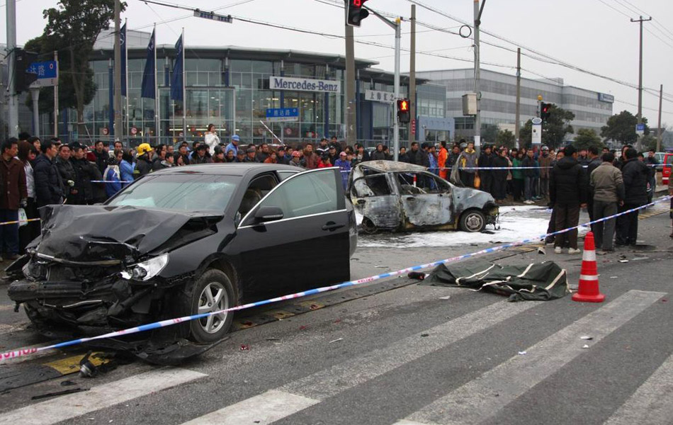 据《新闻晨报》报道,11日下午3点50分左右,浦东新区南六公路、鹿达路路口附近发生交通事故,一辆失控的比亚迪轿车接连撞上另外两辆车,导致其中一辆QQ轿车油箱破裂起火,车内一对男女被烧死。