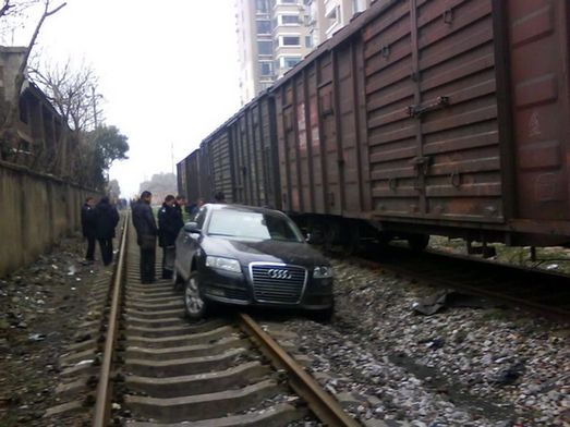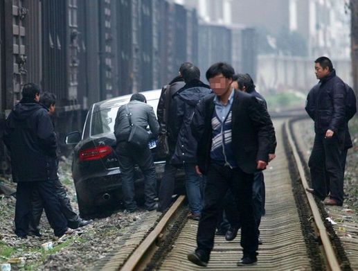 25岁的小伙夏某23日晚酒后驾车竟开上了武汉一处铁路,而且一走就是上百米,直到轮胎被磨破、车底盘被铁轨卡住才停下。他的莽撞逼停了两趟火车,使铁路方面紧急停用了这段铁路。图为2月24日,武汉,奥迪车被卡在铁轨上动弹不得。