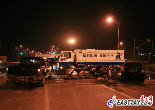 早报记者来到现场时,事故车辆已被拖往附近的浦周停车场暂时停放,但路面上仍然铺满了用于吸附油迹的沙土,以及散落一地的破碎零件。虽然距离事故发生时已有一段时间,但现场弥漫的柴油味仍然相当浓重。数名警察正在现场继续事故清理工作,两部市容环卫的清扫车辆随后也来到路口,清理路面上的油迹与沙土。