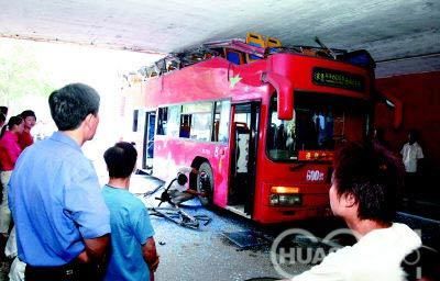 2005年,西安一辆600路双层公交车通过北门外的铁路桥时,误入普通公交车道,超高1米多的公交车顶部被削