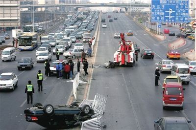 事故现场。周民摄 京华时报讯(记者 郭晓乐)2月8日上午,朝阳区建国路上,一辆轿车自东向西冲过护栏撞向反方向车辆,造成6车连环相撞,两人受伤,事发路段交通拥堵近2小时。 事发三环路国贸桥向东300米左右建国路东西双向车道上。附近报刊亭老板介绍,昨天上午9点20分左右,他突然听到一声闷响,一辆爱丽舍轿车从东向西的主路上冲过护栏,飞到了对面的车道,“太快了,一眨眼,对面车道又有两辆车打着滚翻到了路中央。” 一名女司机说,当时,她正由西向东正常行驶,突然感觉眼前好像飞来一块巨石。接着,感到车被砸中,失控的车辆腾空后倒扣在路面上,她急忙从车中爬了出来。此时,在她车子后面,一辆灰色轿车也被护栏砸中,翻了车。 一名桑塔纳车主说,眼见着护栏和金属底座向他的车袭来,把保险杠和车门都砸瘪了。除了4辆受损严重的轿车外,还有一辆公交车和一辆私家车遭殃,所幸损伤不大。 事发后,呼家楼交通队民警赶到现场处理。由于事发突然,事主们一时也分不清怎么回事。现场一名交警解释,这辆爱丽舍轿车自东向西行驶,可能是司机误踩了油门导致轿车失控,在顶飞了几段护栏后,飞到了西向东的车道上。而由西向东方向的其他车辆纷纷与护栏相撞,导致事故发生。 事故致使一辆轿车内两人头部受伤,被围观群众救出后送往医院治疗。由于涉及车辆多,在清理现场时,建国路事发路段东西双向内侧两条车道均被临时清空,导致东西双向行驶缓慢。截至昨天上午11点30分左右,现场被清理完毕,交通逐步恢复正常。 (本文来源:京华时报) |