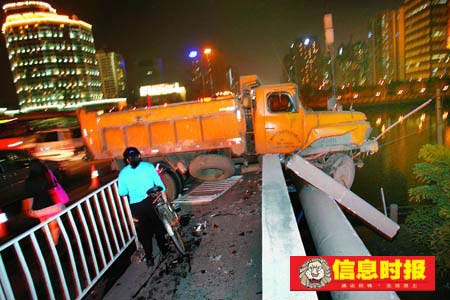 广州大桥“最牛撞车” 司机回答更雷人——“不会开车” 昨晚9时15分,一辆泥头车自北向南在广州大桥上一路“狂奔”:先是撞掉路中间铁护栏,冲过对面车道撞上迎面驶来的一辆的士,之后继续冲向桥边,撞断桥边石护栏,直到车头挂在桥边才熄火。泥头车司机在解释车祸时的回答更加雷人——“不会开车”。 的士被撞后,车内驾驶位气囊弹出,司机李先生右手受伤。泥头车车头挂在桥边,汽车左轮胎橡胶磨掉,被泥头车撞断的护栏散落在车道上。 泥头车司机20来岁,身材瘦小。记者问他车辆失控的原因,司机反复说着“不会开车”。现场交警透露泥头车司机并没有喝酒。 车祸发生后,广州大桥南往北方向大塞车,从上桥至下桥处至少停着10多辆公交车,不少乘客只好下车步行过桥,有乘客看到车头挂在桥边的泥头车惊叹这是今年以来广州大桥“最牛撞车”。至昨晚10时,广州大桥南往北方向依然大塞车。 |