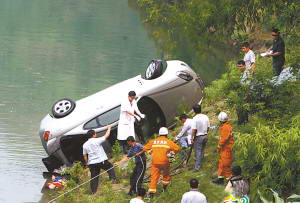 昨下午4时,出事轿车被打捞出水。 昨上午8时45分,北碚区柳荫镇西河村工农水库,3名北碚老人开车来钓鱼。63岁的刘女士在水库上方崖边斜坡公路上挪车时车子意外失控,冲下10余米高的悬崖掉入水库中。虽然附近钓鱼人赶来奋力施救,但刘女士未能及时逃生,不幸遇难。 老人开车来钓鱼 挪车意外冲入水库 当地西河村村民周云忠老人介绍,昨日时逢端午节放假,早上8时起就有不少从北碚城区赶来的钓鱼人。在靠近水库边的山坡公路上,停了不少轿车。 8时40分许,有村民看见一辆银灰色的现代跑车从柳荫镇向金刀峡方向开过来,随后停在了一个靠近水库的直角弯道处。车上共有3人,其中两名男子先提着马扎、渔竿、雨伞等钓鱼工具下了车,并指挥女司机将车倒好。 随后,两男子沿着斜坡梯坎下到水库边,将工具摆好准备钓鱼。目击村民称,不知为何,那辆本已停稳的轿车突然重新启动,并顺势向前冲出,径直从路边坠下10米高的陡坡,“扑通”掉入水库中。 据了解,当时该处陡坡下方,正好站有一名同样来自北碚城区的钓鱼人许某,所幸车身并没有将他砸中,但吓得不轻。 跳入水库砸窗施救 3分钟后车还是沉了 水库对面的几名钓鱼人见有车落水,立即大吼起来:“快点救人啦!”并随后拨打119报警。 现场钓鱼者介绍,该轿车坠入水库后并没有立即下沉,而是漂浮在水面上。车内女司机不停地拍打车门,但就是打不开,情况万分危急。 这时,距离最近的许某立即脱掉衣服裤子,捡起一块石头跳入水中。他游到轿车附近,用力狠砸驾驶室车窗玻璃,但就是砸不烂,车门也无法打开。3分钟后,轿车全部进水,沉入10米深的水底。 潜水员下水打捞 女司机不幸遇难 12时记者赶到现场看到,出事的公路双向两车道,沿水库一侧都有钢缆防护栏。不巧的是,轿车冲出公路的地方恰好有一个突出的绿化区,没有防护栏。 消防战士跳入水库,发现水深超过10米,没有专业装备无法潜到水底打捞。家属们只得在交巡警帮助下,联系了合川一家有专业潜水员及装备的公司帮忙。 下午4时许,在一辆吊车的帮忙下,轿车终于被打捞出水,女司机不幸溺水身亡。 老太是驾驶新手 上路没超过两个月 据家属介绍,死者姓刘,今年63岁左右,两年前从某高校退休。去年,刘老太在子女们的鼓励下考了驾照。今年家里新增了一辆二手自动版现代酷派跑车后,刘老太就一直驾驶,但至今上路没超过两个月,驾驶技术并不纯熟,倒车时常需要旁人指挥。 昨早,在老伴和亲家要求下,刘老太驾车搭载两人来钓鱼,没想到在挪车时发生意外。 家属们说,当时在老伴和亲家指挥下,刘已将车在路边倒好。有目击者称,估计刘发现停车有点歪,可能影响其他车辆,于是上车准备将车向前挪动。对事发原因,其家属猜测可能是踩油门时力度过大,轿车失控冲入水库。 为何钓鱼人无法用石头砸烂车窗玻璃?家属们介绍,该跑车安装的是双层玻璃,所以难以砸烂。 车子落水后如何自救 目前,全国汽车驾驶员理论考试中,经常会碰到这样一个考题:车辆落水时,正确的逃生方法是:A、等待救援人员营救;B、开启车门逃生;C、采取措施阻止水进入驾驶室;D、待驾驶室内快充满水时,开启车门或敲碎玻璃游出。正确答案是D。目击者称,汽车入水后刘老太试图强开车门,属应急措施不当。 车子落水后如何自救?驾驶专家说,首先就是不要慌张,落水之初可用金属硬物或用脚踹开侧窗玻璃逃生。不要试图推开车门,一是由于车内外水压作用推不开,即便推开水一下涌进来人也活不成。正确办法是慢慢等水灌进车内,快要淹满车内即快淹到车顶时,憋一口气把车窗打开,如果劲大可以打开车门,游出来你就得救了! |