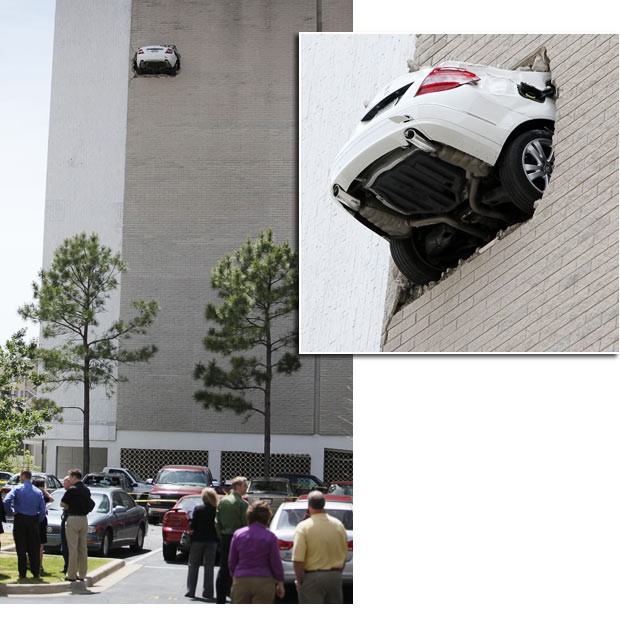 美国俄克拉荷马州,一辆奔驰挂在七楼停车场的墙上。
