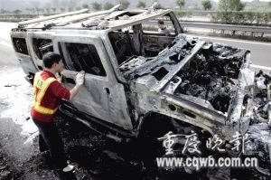 道 昨上午11时50分,一辆价值140多万元的悍马H2豪车,行至渝武高速路合川凤凰湾大桥路段时引擎盖突然起火,最终烧成光架架。据了解,这极可能是国内首辆行驶途中突然起火的悍马车。