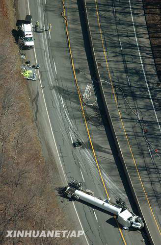 3月21日,一辆运载大量有害化学物氢氟酸的卡车在宾夕法尼亚州东部翻车并发生泄漏,附近大约5000名居民被紧急疏散。除了卡车司机受轻伤外,目前暂无关于其他人员伤亡的报道。这是翻车事故现场。 新华社/美联