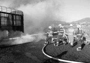 车祸现场,消防人员紧急灭火 记者张广玉/摄