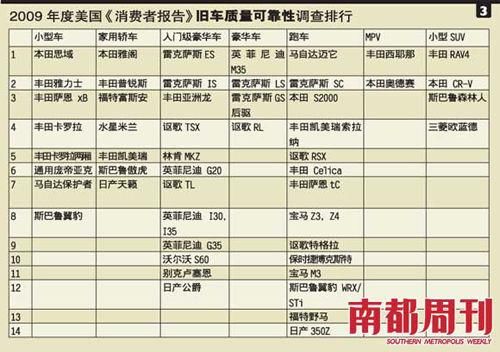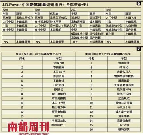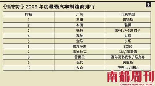 表1是《消费者报告》最近5年对各个车种的最佳推荐车型评选,我们可以看到,日本车占有较大优势。而在《福布斯》公布的2009年度最强汽车制造商排行榜中,丰田、本田则夺走了冠亚军(详见表2)。