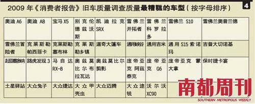 从综合素质排名来看,日本车有绝对优势,那么在耐用性和可靠性方面表现如何呢?这是很多消费者关心的两大指标,可靠耐用标志着质量过硬,也意味着维修费用更低,更令人放心。我们来看一下表3和表4,这是2009年度《消费者报告》旧车质量可靠性调查排行,这个排名是建立在140万辆汽车的基础上进行抽样获得的数据,这些车都是1999—2008年出厂,按照故障数目进行排名,故障数越少则排名越高。