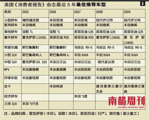 在《消费者报告》最近5年对各车种的最佳推荐车型评选中,日本车占有较大优势。而在《福布斯》公布的2009年度最强汽车制造商排行榜中,丰田本田则夺走了冠亚军。