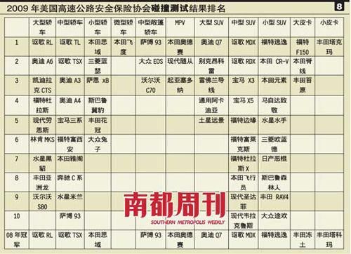 表8是2009美国高速公路安全保险协会测试结果排名,还附有2008年的各项第一名。2009年的测试结果显示,在所有11个车型种类中,本田囊括6项第一,是当之无愧的“安全之王”,其中轿车的所有4个车型冠军全部由本田囊括。在最主流的小型轿车组,也就是消费者购买最多的轿车组,日本车囊括了前5名,分别是本田思域三菱蓝瑟、丰田萨恩、斯巴鲁翼豹、丰田花冠。