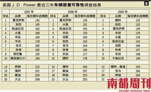 我们再来看看另外一个美国最具权威性的调查——J·D·Power的车辆质量可靠性调查结果(VDS)。今年3月中旬发布的2009年汽车质量调查报告,有4.6万名美国各地车主(拥有该车3年以上)参加,涉及202个问题。排名则是根据每100辆车出现的故障数统计(详见表5)。
