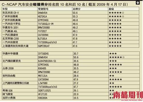 当然,我们也必须看看中国市场的情况。2009年4月16日,中国汽车技术研究中心C-NCAP管理中心公布了2009年最新一批的碰撞测试结果,从2006年11月至今,已经完成了71个品牌汽车的碰撞试验(详见表9)。C-NCAP的数据同样表明,日系车的安全表现最佳,包揽了前四名,而在最后20 名中,没有一辆日本车。