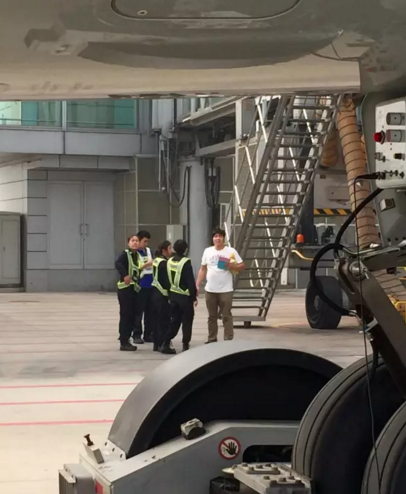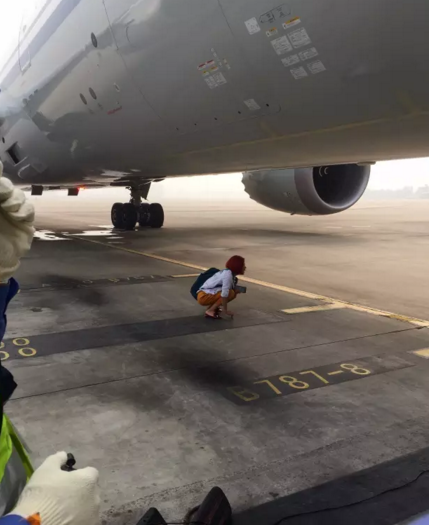 图为该女性旅客,拉着行李强行拦在托车前面,当时登机桥已经撤出。