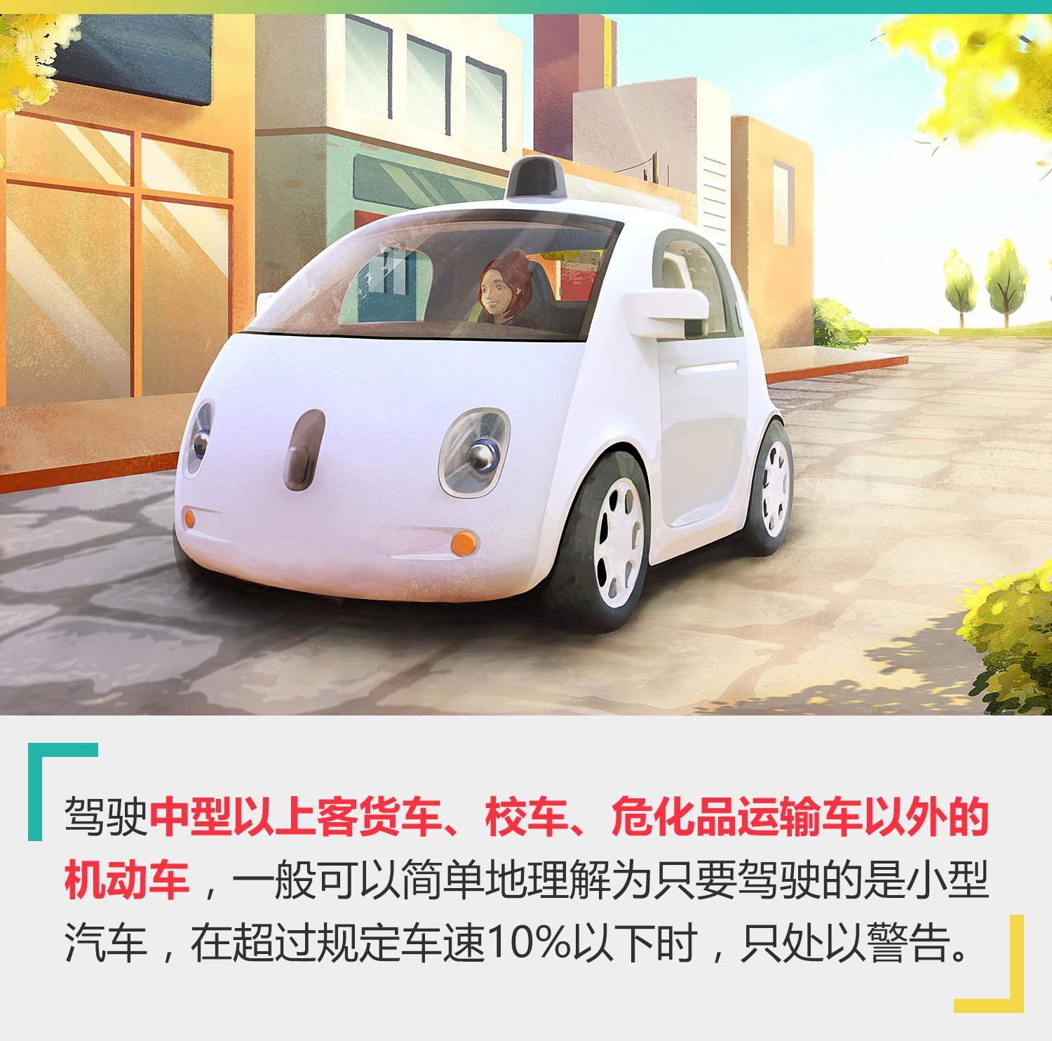 其实这种情形还细分为两种情况,其中之一是指驾驶中型以上客货车、校车、危化品运输车以外的机动车,超过规定车速10%以下的,只处以警告。这句话里面非常关键的一点是中型以上客货车、校车、危化品运输车以外,简单地理解就是,如果我们驾驶的是小型客/货车,超速10%以下是不会被罚款和扣分的。