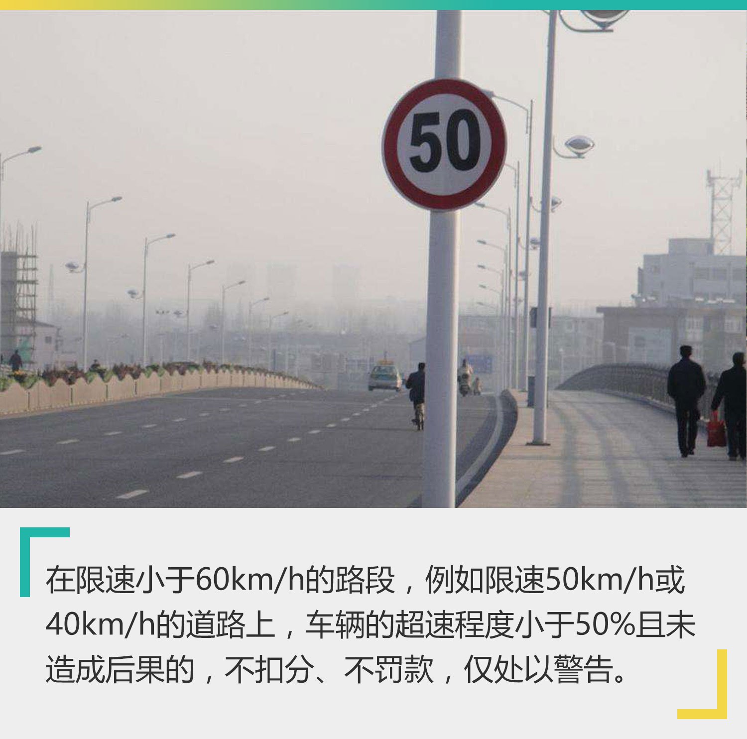 有一点需要大家格外注意的是,根据《关于规范查处机动车违反限速规定交通违法行为的指导意见》的规定,在限速小于60km/h的路段,超速程度小于50%且未造成后果的,同样不扣分、不罚款,仅处以警告。