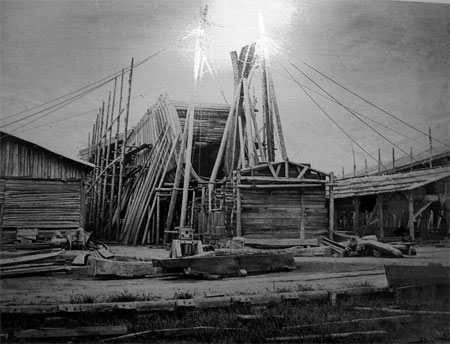 “万年清”即将下水时的照片,可以看到原本垫在船体下方的船台枕木已经被一根根木撑代替。此时的“万年清”船体已经完成,但是桅杆、烟囱等上层建筑还需在下水后装配。