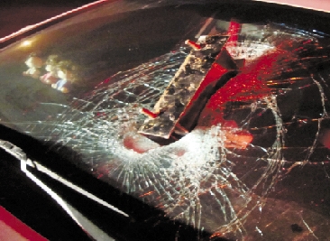 “幸亏是晚上,高速路上没什么车,否则我这么受惊急刹,肯定是要发生追尾的。”杨先生赶紧靠硬路肩停车,并打了报警电话。三人下车后才看清楚,砸破挡风玻璃的原来也是一块铁片,“这跟铁片砸吴斌驾驶的大客车挡风玻璃的情形也太像了吧。”三个人惊出一身冷汗。
