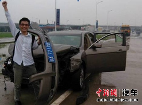 高速车祸车主毫发未伤 现场"V"字手势留影