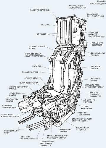 ![]() 火箭弹射座椅应急离机向上弹射的过程是这样的:飞行员拉动弹射手柄,首先抛掉座舱盖,安全带系统和弹射动力系统随即启动。弹射弹击发后推动座椅上升,而安全带系统工作后,飞行员的肩带被拉紧,其两腿收回并固定;护臂装置展开以限制双臂偏摆,并将飞行员肢体定位锁紧,以避免飞行员在弹射和高速气流吹袭后受伤。座椅弹射出舱后。稳定系统射出并展开,座椅遂稳定和减速。在座椅降到规定的、能安全释放降落伞的高度和速度后,分离系统打开安全锁,人/椅分离。并拉出降落伞。飞行员乘救生伞着陆。 单座飞机在低速飞行遇到应急情况时,使用目前比较通用的打开座舱盖锁,由气动力和冷气或火药燃气抛放座舱盖的方法,往往需消耗0.5秒的时间。只有在这段延迟时间之后,人/椅才能弹离,以避免在空中与座舱盖相撞。在低空应急时,这段延迟时间可能会影响到人/椅弹射成功。 串列双座飞机在遇到应急情况时,通常是后座先抛盖、人/椅弹射;然后是前座抛盖、人/椅弹射。以某双座教练机联动抛盖弹射试验结果为例:要使与飞机脱离的前、后舱盖和人/椅在弹射后互不干扰,就得使前座人,椅在后座舱盖抛放1.486秒之后才能弹射。在这极短的时间内。失事飞机飞行高度的损失达40米,这将严重影响降落伞正常开伞的高度,从而危及飞行员的生命安全。为了提高人/椅弹射成功率,总是希望尽量缩短弹射之前抛盖的时间,于是出现了穿盖弹射。这种方式对飞行员来说,会有较高的脊柱损伤概率及体表或装备刮伤的概率。28页所示为弹射座椅穿盖试验。