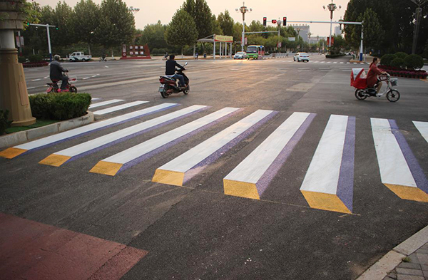 3、彩色三维立体人行道标线 这种标线非常好认,在传统的人行道标线上加入了三维立体图案,给过往的驾驶员以非常强烈的视觉冲击效果,具有很好的提示作用。
