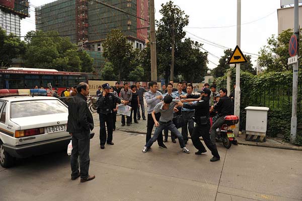 ![]() 小伙对警察来一记“锁喉”。 小伙双脚离地,施展“轻功”。 父亲给儿子助拳,姿势“曼妙”。 小伙嘴巴大张,似乎在说什么。图片均据网友“风定天清” 浙江在线10月17日讯 小伙开辆路虎SUV,一定要从医院的进口开出,保安拦住不让,小伙就动了手,还从车内拿出甩棍(电影《杀破狼》里甄子丹对战吴京用的短兵器)砸保安室。 被带上警车后,小伙父亲又开了辆奔驰轿车来抢人。父子俩对警察大打出手。在被控制住之后,众目睽睽之下,这位父亲还突然躺在地上,大叫“警察打人”。 记者获悉,打人父子,父亲叫陆明福,是一家工程公司老总,兼任鄞州下应街道江六村的村支书。儿子陆科琪,曾在英国留学7年。 事情发生在前天上午,鄞州人民医院北门。昨天,记者从百丈派出所了解到,被打的黄警官被诊断为轻微脑震荡。这对父子已被行政拘留。 小伙拿甩棍砸保安室 老王,30多岁,是鄞州人民医院保安。王师傅说,前天上午,他在医院北门保安室值班。快11点时,一辆“浙BJ999”车牌的红色路虎开到了门口,按喇叭示意要出去。 当时和王师傅一起值班的还有另外两名保安。三人示意这是车辆进口,不能出去。可那辆路虎车依然停在那里,喇叭不住叫。 王师傅说,车喇叭响了大概几十秒,一个身高超过1.8米的小伙子,气冲冲地从车上下来,灰色上衣,下身牛仔裤。 “我从岗亭里走出去,说这里车子只能进不能出,出口在另外一个地方。他说的是宁波话,我听不懂,但他样子很凶,下车就骂人,还动手推了我一把,对着我的头和胸各一拳。”王师傅说。 小伙打人过程被门口的监控拍了下来。记者从监控录像看到,另外两个保安把两人拉开。小伙转身从车内拿出一根甩棍。王师傅躲进保安室里,把门反锁。小伙拿甩棍砸门。 事后记者在现场看到,保安室的门坑坑洼洼。 王师傅说,小伙子最后撂下句“你等着,找人弄你”,把一张停车卡和5元钱扔在地上,开车往出口处走。 父亲开着奔驰S600赶来 百丈派出所黄警官当天正在值班。他说: 10点58分接到报警,说医院北门有人打架。我和一名协警开了辆警车过去,医院北门在一条小弄堂里,穿出去就是甬港北路。 到现场问明情况,保安说他被打了,小伙不说话。我说,能不能和解?小伙子说:“我不会跟你走,我等我老爸”。这时围观的有二三十人,大家起哄说:“你老爸是李刚啊。” 小伙在一边打电话。我想,先把人带回派出所再说,就把小伙带上警车。这时,人群突然被拨开,冲出一名中年男子。他条纹衬衫、黑长裤,自称是小伙父亲。 事后对面工地保安说,男子是开了辆奔驰S600来的,这车要200多万。 父子俩把警察打倒两回 黄警官说,小伙的父亲上来就抢人。“他拉开车门,把他儿子往外拽,还说‘去什么派出所,我们不用去!’我下车把人拦住,男子就用手掐住我的脖子,他儿子趁机跑出来,从侧面冲过来打我的头,我被打倒。” 黄警官第一次倒下后,父子俩大摇大摆要离开。 “我爬起来,又上前去拦。两人又打我,我只好用辣椒水喷,结果父子俩下手更重了。”黄警官第二次被打倒。 幸好,这时有其他民警赶来,将父子俩控制。 没想到,男子突然倒在地上,哭着说“警察打人”。黄警官说,幸好现场人多,有人喊“别装了,我们都在这里看着的”,父子俩才老实上了警车。 黄警官的讲述,记者从目击者陈大姐、小章等人那里得到确认。 打人小伙曾留学,他爹刚当上村支书 记者从可靠途径得知,打人小伙叫陆科琪,23岁,曾在英国留学。他爹陆明福49岁,是一家工程建设公司老总,还是下应街道江六村村支书。 黄警官说,他现在还头晕、干呕,医院诊断为“轻微脑震荡”。 警方表示,小陆故意殴打他人、妨碍公务,被行政拘留15天;老陆妨碍公务,被行政拘留10天。下一步处理要看黄警官伤势,如果伤重,依法可转为刑事处罚。 |