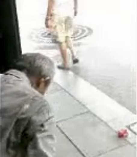 老人塑料袋被撕破,袋内的塑料瓶、纸品洒落车内、车外一地。视频截屏图