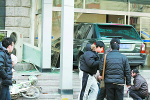 女司机将油门当刹车 路虎撞进大厦门厅