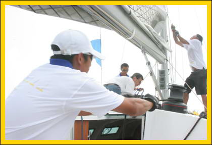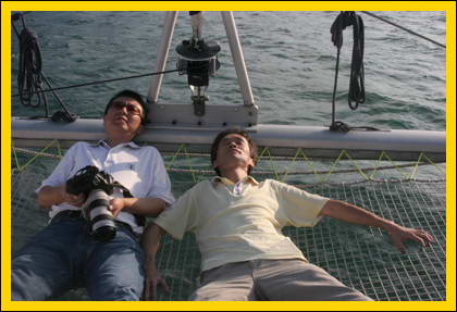 邀请者是有钱人渔夫。从玩帆船,到买帆船纵横四海,到承办首届“中国杯”帆船赛,这老兄这几年也不知道吃了什么药,野心越来越大。估计,大海私下给个他不少灵气。晚饭时,渔夫与500万.com老板老罗、腾讯副老总小刘、SIG的老板把酒言欢,大谈资本运营之道,听得兽医两个门槛牙摇啊摇,摇到外婆桥。渔夫信誓旦旦地说:要把中国杯打造成足以与“美洲杯”“VOLVO环球赛”抗衡的赛事。对此,兽医旗帜鲜明地点点头……但心里却开着小差、哼唱着歌儿:兽医婆在哪里呀?兽医婆在哪里?兽医婆在她娘的肚子里,这里有红花呀,这里有绿草,还有那会唱歌的小黄鹂,嘀哩哩嘀哩嘀哩哩……