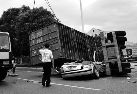 轿车被集装箱车压成肉饼 车上三人无大碍