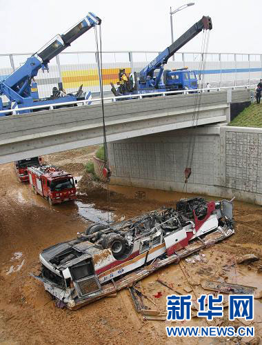据韩国媒体报道,一辆巴士3日下午从仁川跨海大桥上坠落至桥下泥滩,造成12人死亡、8人重伤、4人轻伤。 当地时间13时20分许,这辆从东南部城市浦项开往仁川国际机场的巴士在经过大桥终点的收费站后,突然撞破围栏坠落至距桥面约10米的泥滩。 此前韩国媒体曾报道说,事故巴士上载有40余名乘客。 警方在初步分析后认为,巴士是为躲避一辆因故障而停在路面上的小汽车而坠桥的。事故发生后,警察和消防人员迅速展开救援工作,并用起重机将严重损毁的巴士吊起。 据救援人员统计,到目前为止,在包括司机在内的24人中,有12人死亡,另外12名不同程度伤者已被送往附近医院接受救治。