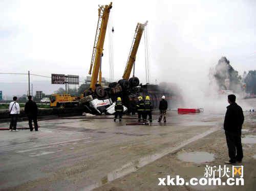 京珠高速槽罐车刹车失控侧翻 53吨盐酸泄漏